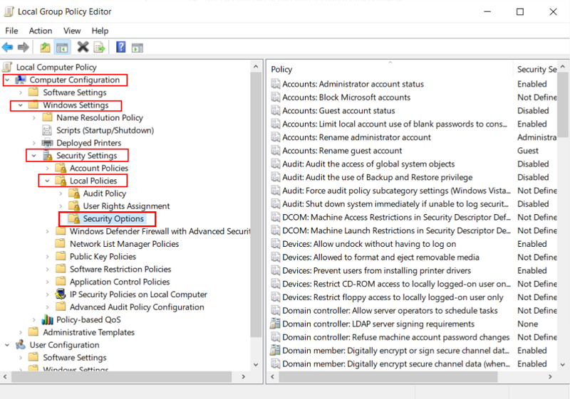 Идём в ветку Computer Configuration\Windows Settings\Security Settings\Local Policies\Security Options