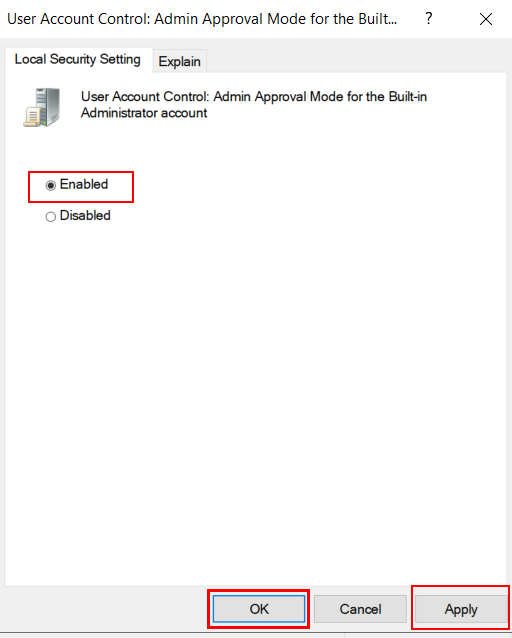 По-умолчанию состояние политики выставлено Disabled и администратор работает с полными правами без лишних запросов UAC. Должно вообще не напрягать, но, как видим, это не совсем так. Если выставить Enabled, то поведение UAC для администратора должно быть такое же, как у обычного пользователя: при необходимости повысить привилегии в системе выскочит окно подтверждения. По факту ничего не выскакивает 🙂 Именно этот режим нам и нужно включить.